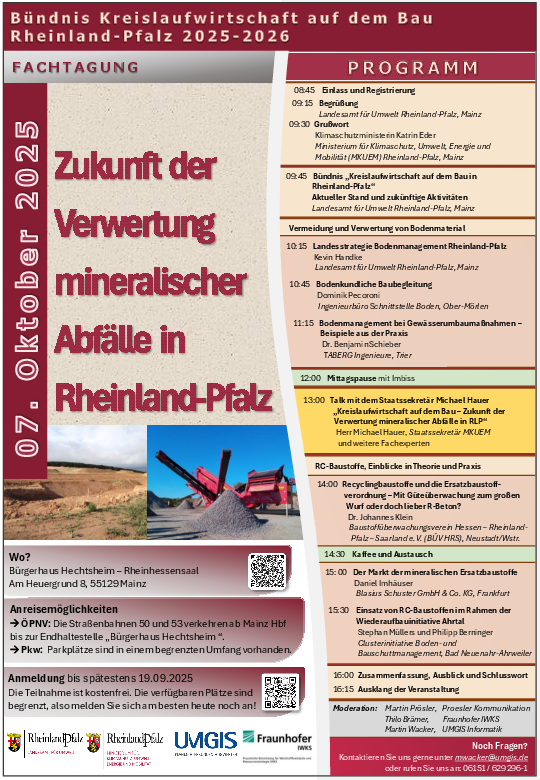 Am 7. Oktober 2025 kamen rund 120 Fachleute aus Politik, Verwaltung, Wissenschaft und Bauwirtschaft im Bürgerhaus Mainz-Hechtsheim zusammen, um über aktuelle Entwicklungen und Herausforderungen der Kreislaufwirtschaft im Bauwesen zu diskutieren. Die ganztägige Veranstaltung, organisiert vom Landesamt für Umwelt, der UMGIS Informatik GmbH und dem Fraunhofer IWKS, zeigte sehr deutlich, dass Rheinland-Pfalz auf einem guten Weg ist, den ressourcenschonenden Umgang mit mineralischen Abfällen weiter auszubauen, auch wenn insbesondere regionale Unterschiede und logistische Schwierigkeiten weiterhin eine zentrale Herausforderung darstellen.