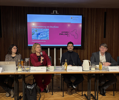 Ab sofort können Bürgerinnen und Bürger sich in Rheinland-Pfalz anhand einer 3D-Visualisierung über ihr individuelles Sturzflutrisiko informieren. Möglich macht das der HydroZwilling, den das LfU mit dem Klimaschutzministerium entwickelt hat. Vorgestellt wurde die neue Anwendung von Ministerin Katrin Eder und LfU-Präsident Dr. Dirk Grünhoff im Rahmen einer Pressekonferenz am 5. Februar 2026 (Pressemitteilung).